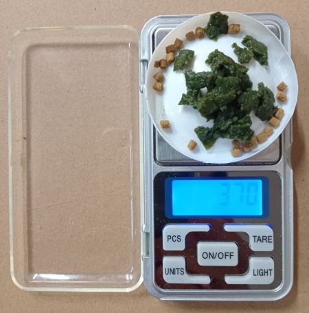 A mix of Repashy and pellet foods ready to feed outI recently encountered this problem while feeding a group of young Black Moor for a growth experiment. I noticed they weren’t growing as fast as I expected.After weighing the fish, I found I was feeding them at 2% of their body weight per day, not 3% as I thought. Feeding by WeightAs I have mentioned before, Goldfish should be fed between 0.50 and 3% of their body weight daily, depending on water temperature. Feeding above 3% is pointless as they don’t process the food efficiently.To show how much weight increases as Goldfish grow, listed below are the weights of a young Moor over 3-months, showing the dramatic increase in weight at each 10 mm (3/8") increase in length. 50mm 8.5g So, feeding an 80mm Goldfish weighing 45 grams at 3% of its body weight per day, that works out to 1.35g of dry food daily. But this fish grew 10mm in three weeks. It now weighs 68g, a 51% increase in weight, so now it should be fed 2.04g per day. Feeding 1.35g per day is only 2% of its body weight, so the fish will slow down growth from now on and get progressively slower if feeding isn’t increased. Gel FoodsThere is a danger with gel foods in that they have a high water content. For Repashy foods mixed at one part food mix to three parts water, that is 85%.This means if you feed a 68-gram fish dry prepared food at 3% body weight per day, the amount of food required is 2.04 grams (68g x 0.03). However, if you are feeding a gel food, you need to feed 13.6 grams (2.04g/0.15) to achieve the same feeding level. Temperature Based FeedingI use five key temperature ranges when feeding my adults.1. 10oC and under, I don’t feed them. For amounts above 1%, the feedings need to be spread over three feedings or more, as it takes a while even then for the fish to consume that amount of food. I feed 50% Repashy (dry weight equivalent) and 50% pellets split over three feeds, and at 3%, my fish take about 10-12 minutes to get through the food. For my adults that are big enough, I feed at 2% split over three feeds during the growing season when temperatures are above 20oC. I would limit feeding to no more than 1% per day for those who do not want their fish to quickly out-grow their aquarium. The fish will still grow but much slower than if fed at 3%. ConclusionsIf you have juvenile fish you want to grow quickly, or even undersized adults, you need to check their weight frequently. At 25oC and above, I weigh my fish weekly.Don’t over-feed your fish. 3% body weight per day is a large amount of food, and the most Goldfish can process efficiently. This amount should only be fed to juveniles and undersized adults. Don’t under-feed your fish. Gel foods are mostly water, so they are only equivalent to 15% of the same weight of dry food. I use jewelers’ scales to weigh out food portions for each of my ponds and aquariums as each holds different numbers and sizes of fish. Comments? Ideas? Feedback? I'd love to hear from you. Just reply to this e-zine and tell me what you think, or what topics you want to be covered. www.facebook.com/aboutgoldfish |