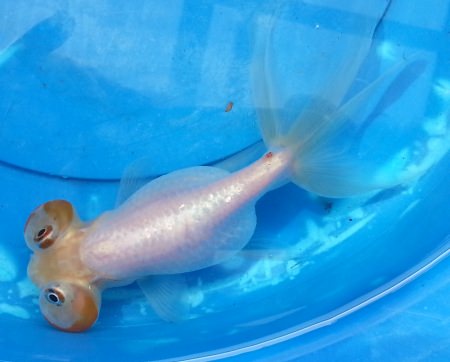 Goldfish Care TipsA Free Monthly Resource For Goldfish Enthusiasts In This Issue Metallic scaled Goldfish change color early in their development, then many change color again, usually to white. Color ChangesOrange Bubble Eye changing to whiteBefore discussing why your Goldfish is changing into another color, first we need to discuss the different scale types possible. Scale type is actually a misnomer as scales themselves are translucent and colorless. It is the pigment cells and guanine in the skin that determine the color of a Goldfish.Scale TypesMetallic - The most common scale type, with the fish being a single color or two, one color being black, yellow, orange or red, the other being white. The scales are highly reflective and look like polished metal in strong sunlight. Black varieties are the exception having a satin like appearance.Any black coloration that is not the primary color of the fish, such as on a Black Moor, will be due to the fish still going through its first color change, or the fish has sustained skin damage from injury, chlorine/chloramine burns or ammonia/nitrite burns. The black color seems quite unstable, and all black fish have a high probability of the black fading away and being replaced by another color. Panda Moors are a good example of this, with most turning completely white over time. Metallic fry are a drab gray color when young, and first change to a dark color. That fades to a light yellow, beginning in the lower belly area before moving up the body and finally into the fins. The intensity of the dark color depends on light conditions the fry are kept in. Under natural light the fry will turn black. In artificial light the fry sometimes only show the faintest hint of darkening before the color starts to fade and be replaced by a light yellow, which darkens depending on lighting. Fish kept outside develop far deeper colors than those kept indoors. Metallic fish will develop more intense coloration no matter what age if moved outdoors. The most common color change for yellow, orange or red metallic fish, is to white. A sure sign the fish will ultimately change color is if there is any white present on the fish after its first color change. White areas tend to increase in size until they completely replace the original color. What triggers this change isn't known, but it is genetically linked as the more developed varieties seem more prone to changing. Matt - This scale type describes fish having a translucent or flat coloration, exactly the opposite to metallic scaled fish. There is no reflective tissue present, not even in the eye orbit which is black. There is little color, often none making the goldfish appear pink and translucent. This goldfish scale type is the least popular because of the lack of color options, and it appears to be less robust than the other types. Matt coloration seems to remain stable throughout a fish's life. Nacreous (Calico) - This scale type is a mixture of translucent and reflective tissue, giving rise to the greatest possible number of colors on a fish such as orange, red, blue, brown, black and white. This scale type also seems to remain relatively stable if fish aren’t kept in strong sunlight which tends to fade their colors. Black areas on nacreous scaled fish do not fade. The three scale types above were once the only scale types known. Today, there are four other scale types that are becoming more common, they are Mock Metallic, Blue Belly, Pseudo Matt and Colored Matt. Mock Metallic fish are single colored fish with translucent areas of the body. Over time, guanine deposits that give metallic fish their reflective appearance increase until the fish appears indistinguishable from any other uncolored metallic fish. The Blue Belly goes through a color change so there could be some color instability, but the Matts’ color stability should be similar to nacreous scaled fish. Celestial Fry Growth TestYou may remember in last month’s Gazette an experiment I am conducting with a few Celestial juveniles.I am trying to determine how fast I can grow them to 75mm, and more importantly, what their food conversion rate (FCR) is. I measured and weighed the test fish at 12 weeks and was somewhat disappointed at their size. They had increase length by just 7%, when earlier they were averaging 17%. After weighing, I saw the fish now weighed 9 grams on average, meaning I should have been increasing food up to 6 grams a day. I had only been feeding 3 grams, hence the slowdown in growth. The FCR has improved from 6.5 to 4.8. With better record keeping I expect it will improve further. The next measurements in 3 weeks from now should confirm the expected growth rate has returned. Comments? Ideas? Feedback? I'd love to hear from you. Just reply to this e-zine and tell me what you think, or what topics you want covered. Next Month's Topic Plant Sterilizingwww.facebook.com/aboutgoldfish |